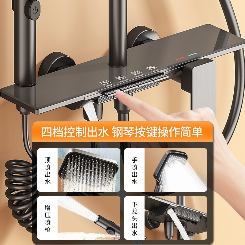 Digital Display Piano Style [All-Copper Four Levels Gunmetal Gray Square] Pressurized Shower Set